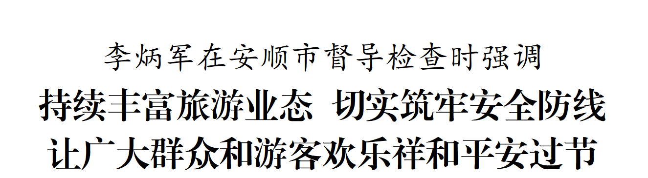 9月28日至29日,省委副书记、省长李炳军到安顺市关岭自治县、西秀区,督导检查国庆中秋假期文旅市场和安全生产工作。他强调,要深入贯彻习近平总书记在贵州考察时的重要讲话精神,认真落实全国安全生产和秋冬季森林草原防灭火视频会议要求,持续丰富旅游业态,切实筑牢安全防线,让广大群众和游客欢乐祥和平安过节。